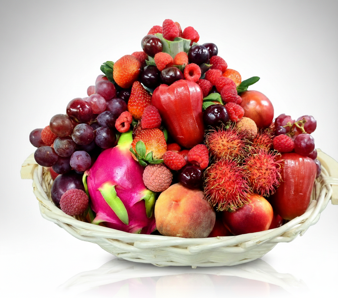 One sure way to warm hearts on Valentine's Day is by giving a basket full of delicious fruits. This fruity gift includes wholesome and juicy Strawberries, Raspberries, Mandarin, Mango, Nectarine, Pomegranate, Peach, PinkLady Apple, Rambuttan, Tomrilo, Pineapple HoneyGlow, Dragon fruit, Lychee, Grapes Red, Orange, Cherry & RoseApple Red.